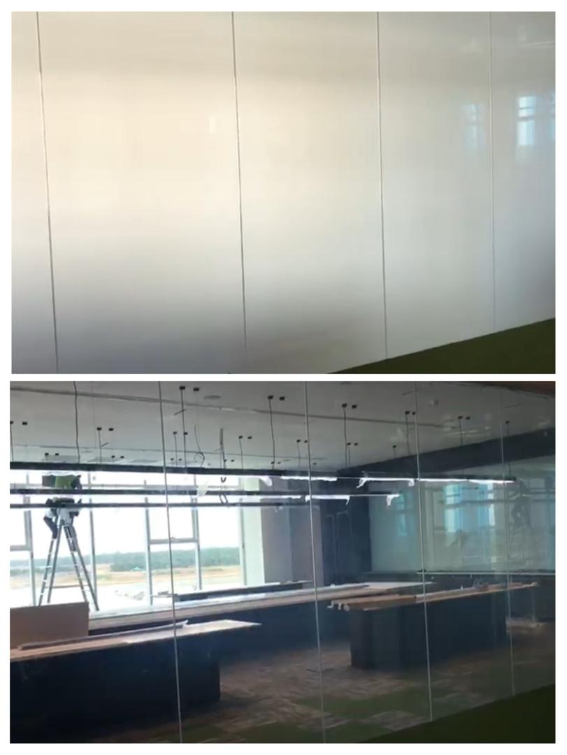 Features one: Switchable Privacy by controlling the glass system by power-on to transparent mode and power-off to opaque mode.
